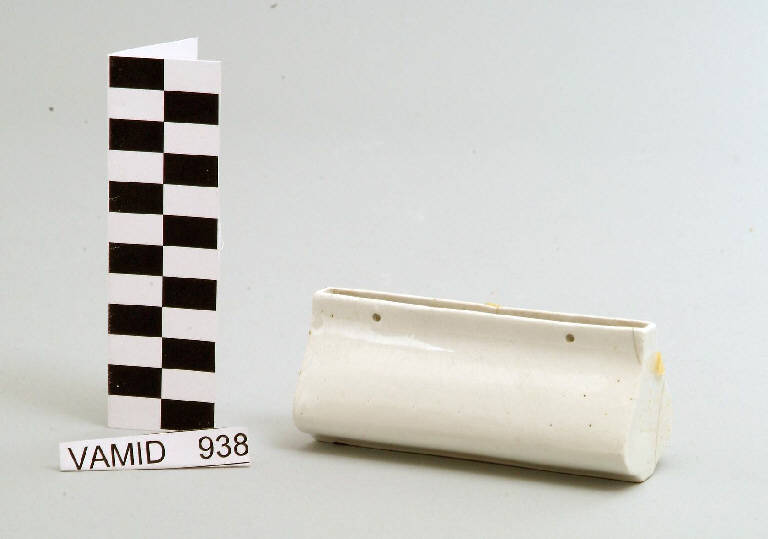 Portacarte di forma allungata con piede rettangolare e corpo panciuto; restringimento in prossimità del bordo superiore; fondo bianco uniforme.