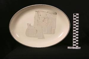 Piatto da portata di forma ovale; fondo bianco avorio con motivi decorativi geometrici in monocromo grigio nel cavetto; bordo rifinito in nero.