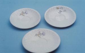 Il servizio è composto da tre piattini circolari con motivo a rilievo; fondo bianco decorato con fiori policromi in posizione decentrata sul fondo.