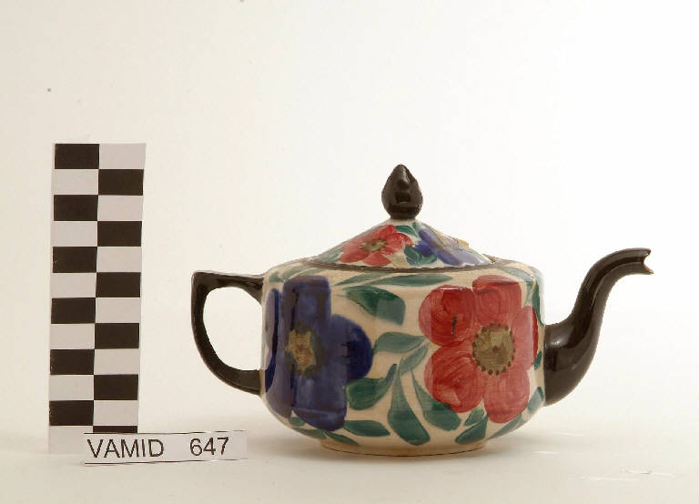 Caffettiera con corpo leggermente scanalato; manico rettangolare; coperchio con terminazione in nero; fondo bianco avorio decorato con grandi fiori in blu, rosso, verde e giallo; bordi rifiniti in nero.
