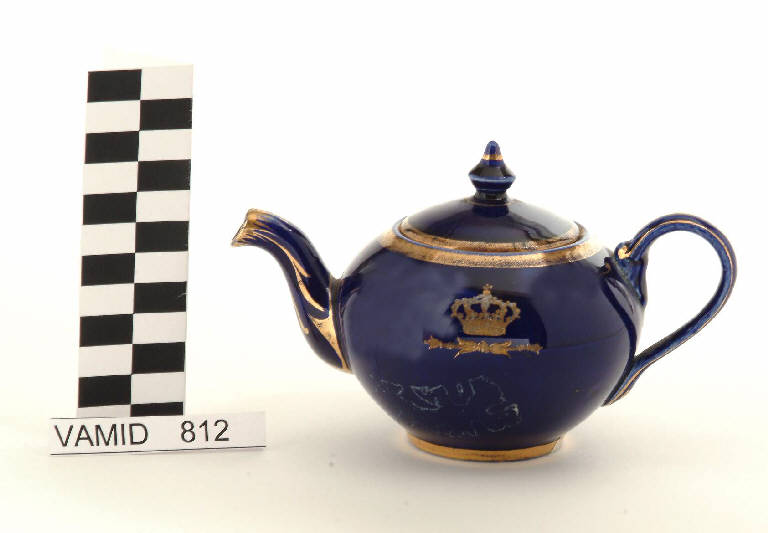 - NOTIZIE STORICO CRITICHE La teiera, appartenente ad un servizio da thè composto da cinque elementi (nn. inv. 812-816) eseguito su disegno di Luigi Reggiori, reca la corona del Regno d'Italia. Il confronto stilistico con un servizio da tavola (cfr. nn. inv. 817...2438) prodotto dalla S.C.I. nel 1923 decorato anch'esso con la corona del Regno d'Italia fa ipotizzare una datazione tra gli anni '20 e '30 del Novecento (cfr. "La terraglia italiana", p. 177). La coloritura blu cobalto è eseguita sottosmalto mentre il decoro è eseguito soprasmalto.