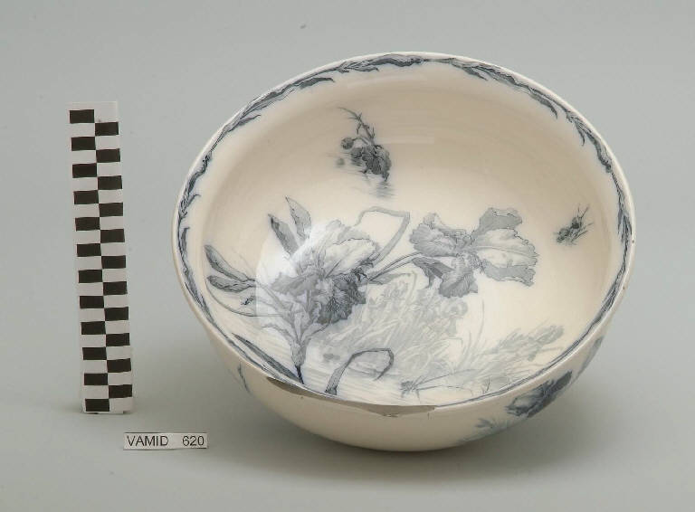 - NOTIZIE STORICO CRITICHE Il catino lavamano, appartenente ad un servizio da camera (nn. inv. 620-621), è decorato sottosmalto con transfer di colore blu. Le prime manifatture a utilizzare la decorazione a stampa mediante una lastra di metallo incisa furono le francesi e le inglesi. La tecnica fu poi presto esportata in altri paesi. Questa tipo di decoro reso in modo naturalistico con chiaruscuro ed effetti di luce si diffuse in tutta Europa a partire dalla fine dell'Ottocento. Il confronto stilistico con altri servizi da camera della medesima manifattura decorati con motivi vegetali simili fanno ipotizzare una datazione a cavallo tra il XIX e il XX secolo.