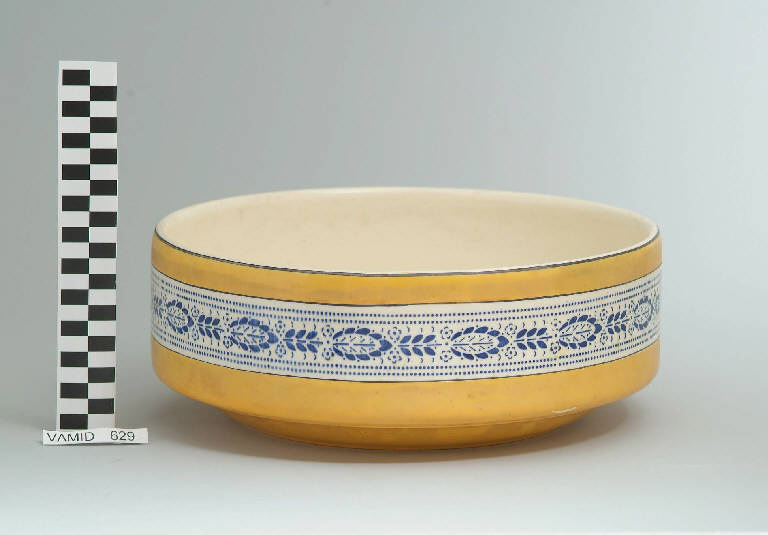 Catino lavamano di forma cilindrica; fondo giallo con motivo decorativo vegetale stilizzato in blu all'esterno; bordo rifinito in nero; bianco internamente.