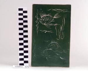Piastrella di forma rettangolare; fondo color verde decorato con motivo animale (pesci) in bianco.