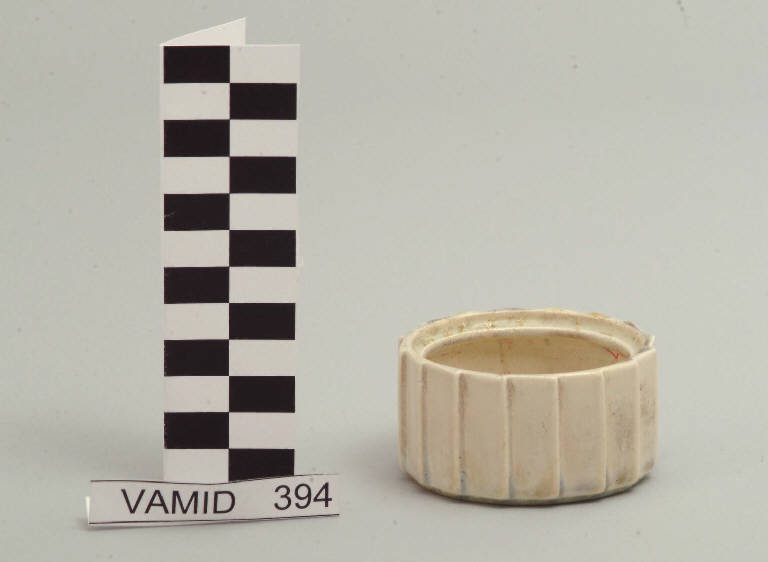Scatola di forma circolare con motivo a coste verticali a rilievo; fondo uniforme color avorio.