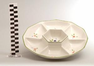 Antipastiera con orlo ondulato; sei scomparti laterali e uno centrale; motivo a corda sull'orlo; fondo bianco con motivo decorativo floreale stilizzato dipinto a mano sotto e soprasmalto in verde, blu e rosso; bordo rifinito in verde.