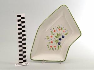 Piatto lunetta per antipasto con motivo a corda sull'orlo; fondo bianco con motivo decorativo floreale stilizzato dipinto a mano sotto e soprasmalto in verde, blu e rosso all'interno; bordo rifinito in verde.