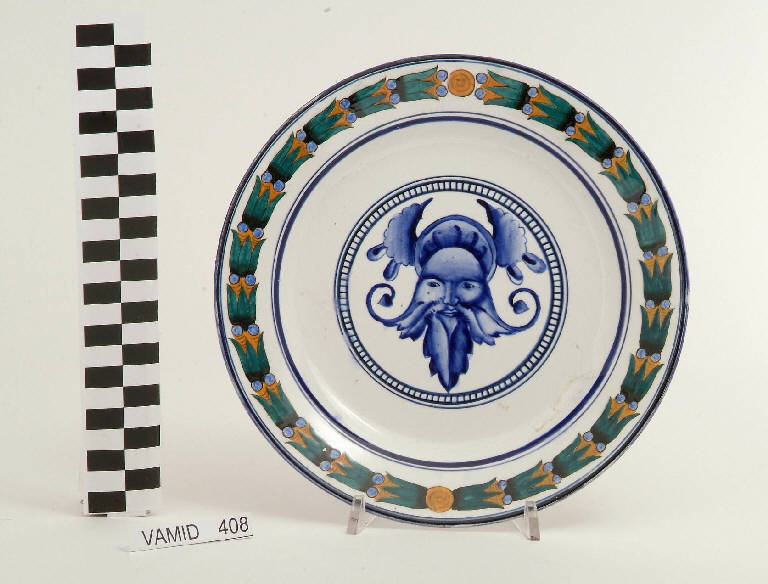 Piatto circolare; fondo bianco con testa in blu al centro del cavetto e greca con motivi vegetali in verde, azzurro e giallo lungo la tesa; bordo rifinito in blu.
