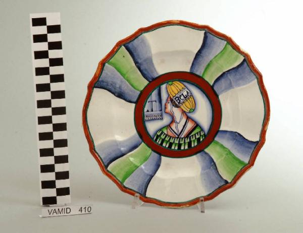 Piatto con orlo ondulato; fondo bianco con volto di dama di profilo in verde, giallo, azzurro, nero e marrone al centro del cavetto; bordo rifinito in marrone.