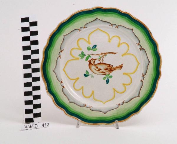 Piatto con orlo ondulato; fondo bianco con uccellino appeso a una ramo in marrone e verde al centro del cavetto e motivi decorativi geometrici in giallo, marrone e verde lungo l'ala; bordo rifinito in marrone.