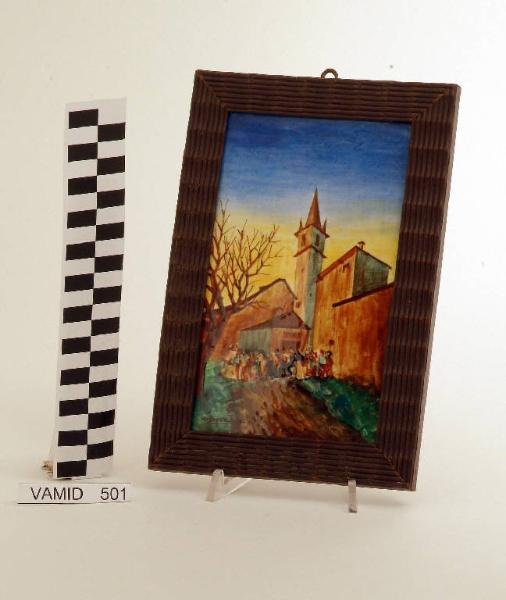 Piastrella di forma rettangolare decorata con veduta di chiesa policroma.