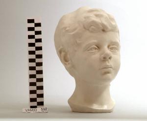 Scultura a forma di testa di fanciullo; fondo bianco uniforme.