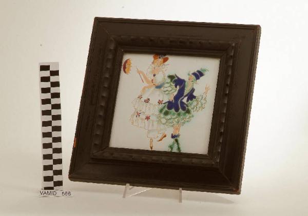 Piastrella di forma quadrata; fondo bianco con figure con maschere in verde, blu, marrone, giallo e rosa.