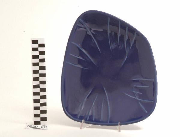 Vassoio di forma trapezoidale con angoli stondati; fondo blu cobalto uniforme.