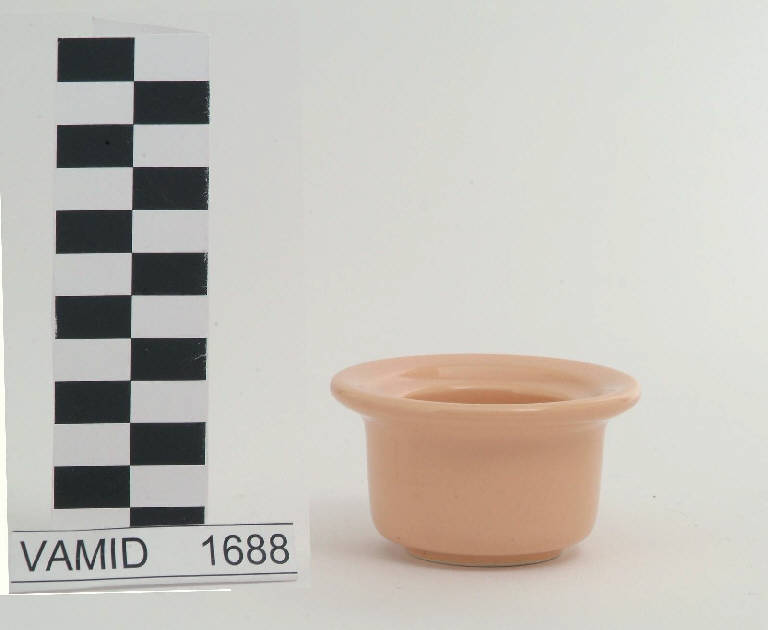 Portacandela con corpo cilindrico; bordo estroflesso; fondo color rosa chiaro.