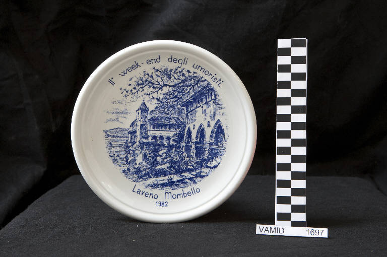 Piatto circolare privo di tesa; bordo rialzato; fondo bianco con veduta di Laveno Mombello in blu.