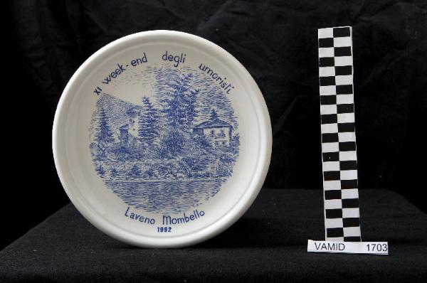 Piatto circolare privo di tesa; bordo rialzato; fondo bianco con veduta della località Acquanegra a Laveno Mombello in blu.