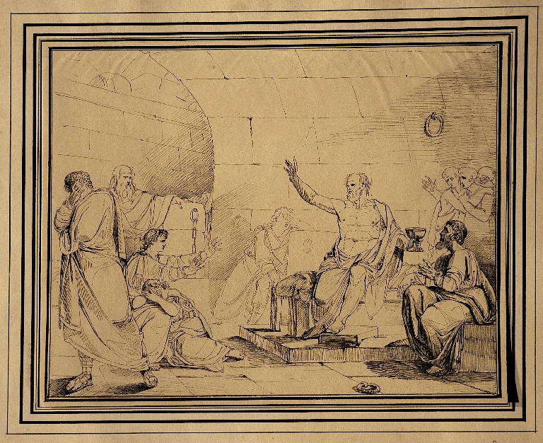 - NOTIZIE STORICO CRITICHE La firma "Bruni" si legge sull'anello in basso a destra; il soggetto, tratto dal Fedone di Platone, è reso in uno stile semplice e sintetico, con un'attenzione al valore della gestualità e delle emozioni contenute dei personaggi che richiamano, in un artista attardato, "Il giuramento degli Orazi" di David (esposto a Roma nel 1785). Il periodo di datazione proposto tiene conto dell'anno in cui il pittore arriva a Roma, il 1818; la metà degli anni trenta è indicata come termine ante quem ritenendo poco plausibile l'esecuzione stilistica di marca neoclassica dopo questa data.