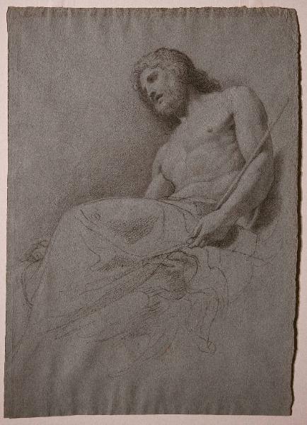 - NOTIZIE STORICO CRITICHE Il disegno è stato esposto alla mostra dedicata alla collezione di Riccardo Lampugnani che il Museo Poldi Pezzoli ha organizzato nel 1997 ("Riccardo Lampugnani: una collezione milanese donata al museo Poldi Pezzoli", Milano 1997, p. 20, n° 40). In quella occasione, questa bellissima figura d'uomo, indagata con lievi tocchi finissimi di matita e gessetto bianco e un secondo foglio, in cui compare uno studio ravvicinato della sola testa, appena variata nei tratti e nell'inclinazione del volto (inv. 4673), sono stati accostati all'immagine di Giove che Andrea Appiani dipinse, attorno al 1792, nel tondo con la "Apoteosi di Psiche" della Rotonda della Villa Reale di Monza (cfr S. Coppa, scheda 9 in R. Barilli, a cura di, "Canova e Appiani. Alle origini della contemporaneità", catalogo della mostra, Milano 1999, pp. 161-162). Marta Pivetta, qualche anno dopo, conferma l'attribuzione e l'ndicazione critica, aggiungendo che la figura di Giove compare, quasi identica, nella medaglia con "Mercurio e Psiche al cospetto degli dei" che Andrea Appiani eseguì, probabilmente negli stessi anni, nel Palazzo Busca di Milano (oggi Collegio San Carlo; cfr. M. Pivetta, scheda VI.35, in "Il Neoclassicismo in Italia da Tiepolo a Canova", catalogo della mostra, Milano 2002, p. 455). Ai due affreschi, e in particolare alla figura di Giove, Andrea Appiani dedicò numerosi studi: tra gli altri, sembra particolarmente vicino a questo il foglio conservato nei Musei Civici di Brescia (cfr. A. Cera, a cura di, "Disegni, acquerelli, tempere di artisti italiani dal 1770 ca. al 1830 ca.", Bologna 2002, vol. I, tav. 7); accanto all'immagine del dio, ritratto nell'identica posizione del disegno Lampugnani, con l'aquila ai piedi, Appiani delinea con brevi tratti di matita la figura che, con poche varianti, comparirà alla destra di Giove nell'affresco di Monza. Il foglio di Brescia, quindi, come indica anche la presenza della quadrettatura, appartiene con ogni probabilità ad una fase appena più avanzata del progetto.