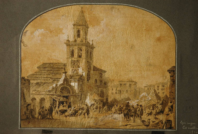 - NOTIZIE STORICO CRITICHE Una foto del disegno, non datata, è conservata nell'album Lampugnani D. 6. Sulla cornicetta, Riccardo Lampugnani ha annotato un breve appunto: "Giuseppe Canella 1820".\nL'attribuzione è senz'altro da confermare: la scena minutamente descritta, popolata di vivaci figurette, rimanda infatti ad alcuni dei disegni più noti dell'artista, e soprattutto, a mio avviso, alle vedute di piazze e scorci parigini eseguite durante gli anni del soggiorno nella capitale francese, tra il 1823 e il 1832, e di cui resta testimonianza nel celebre album conservato nelle Civiche Raccolte d'arte milanes (cfr. M. Pittaluga "L'album parigino di Giuseppe Canella", in "Antichità viva", 1972, n° 1, pp. 27-34): si vedano, in particolare, i fogli con la "Chiesa di S. Eustachio" e l'altro, con una scena di mercato, assai simili per l'accurata ambientazione architettonica e per lo sguardo acuto, quasi fiammingo, con cui Canella indaga i dettagli di quelle scene di vita quotidiana (cfr. R. Bassi Rathgeb "Il pittore Giuseppe Canella 1788-1847", Bergamo 1945, tavv. XXXIV e XXXV). La piazza ritratta nel disegno Lampugnani non sembra, tuttavia, francese: spagnola, piuttosto, per alcuni particolari di architettura molto ornata, e per l'abbigliamento dei personaggi maschili, con il caratteristico cappello a falde larghe e cupola alta e stretta. Giuseppe Canella fu in Spagna per qualche tempo, tra il 1820 e il 1822; ma di quel periodo della sua attività ben poco si conosce. L'acquerello della collezione Lampugnani potrebbe essere la rielaborazione, di qualche anno successiva, di un rapido appunto preso dal pittore durante quel suo viaggio spagnolo, che lo portò a sostare a Barcellona, Valencia, Alicante e Madrid.