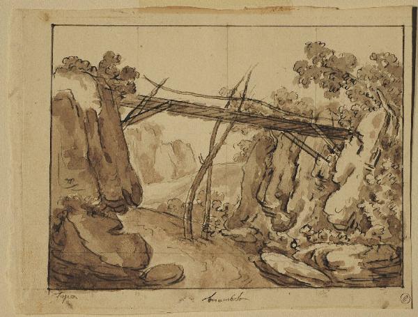 Scena raffigurante un ponte in legno tra le rocce. Paesaggio fluviale