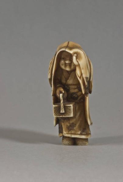 Netsuke raffigurante una donna, probabilmente una contadina, con un cestino nella mano destra; forse per ripararsi dalla pioggia, tiene il suo soprabito sollevato a coprire la testa e le spalle, mantenendolo in alto per un lembo del colletto.
