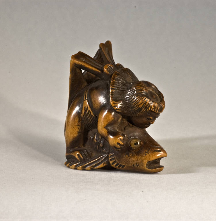 Il netsuke raffigura il piccolo ma fortissimo Kintaro che cavalca un'enorme carpa. Le pinne posteriori del pesce si levano in alto fino a toccare i due pezzi di tessuto che circondano il collo del bambino prodigio.