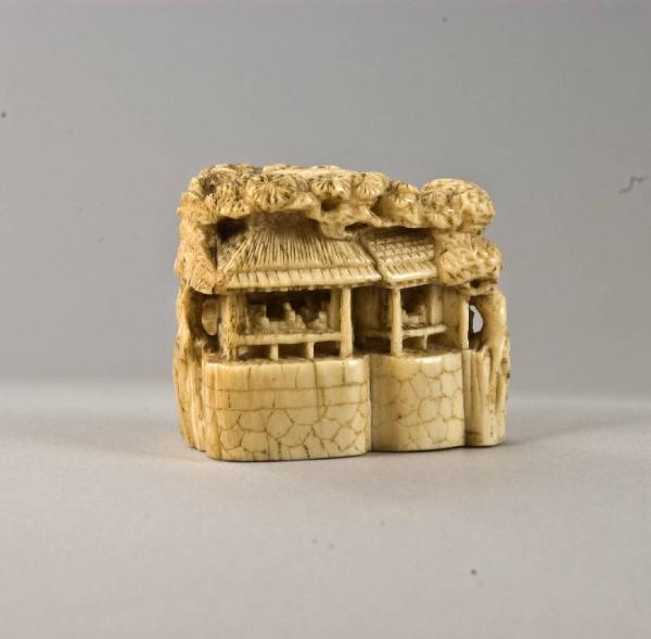 Questo netsuke, di forma compatta, raffigura un paesaggio con padiglioni verandati abitati da piccole figure e sovrastati da alberi di pino (matsu); le abitazioni posano su rocce e, per un tratto, su un muro di pietra.