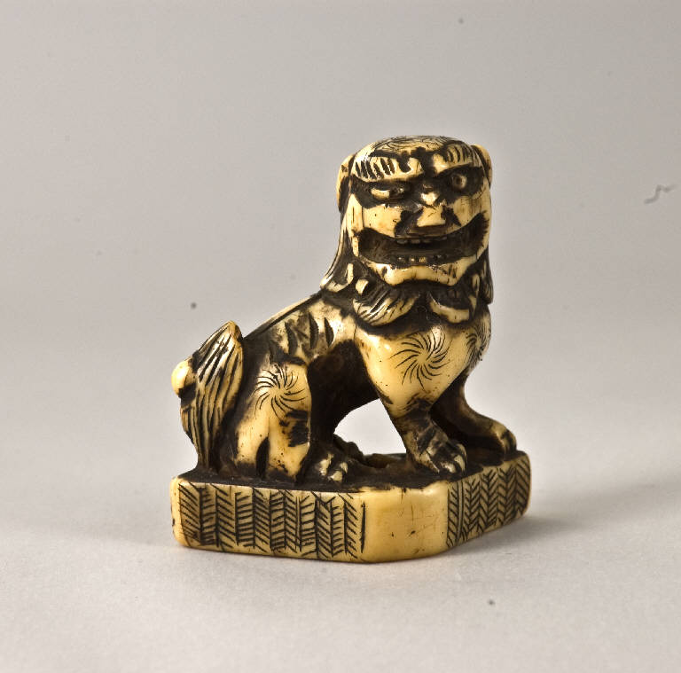 Netsuke raffigurante uno shishi seduto sulle zampe posteriori, posato su un plinto a sezione all'incirca triangolare.