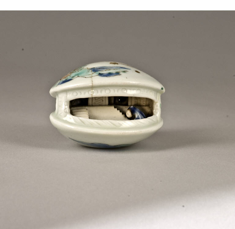 Netsuke raffigurante una conchiglia di aliotide(awabi) semiaperta, all'interno della quale è stata inserita una scena con figure e architetture. Si vede un padiglione al quale si accede tramite una scalinata e nei pressi di quest'ultima è inginocchiata una figura femminile, adorante due statue di divinità sistemate all'interno dell'edificio. La superficie della valva superiore è ravvivata da uno scorcio di paesaggio lacustre, mentre quella inferiore, mostra solo due colline.