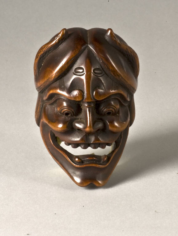 Netsuke raffigurante una maschera (men) dai tratti demoniaci: corni ripiegati sulla testa, lunghi canini acuminati, zigomi gonfi e zona inferiore della fronte aggrottata; i capelli sono divisi in due al centro della testa.