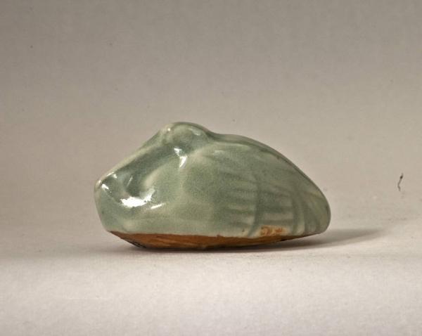 Netsuke in porcellana ricoperta di una spessa invetriatura di tipo céladon, raffigurante un uccello dal becco lungo, probablimente una gru, accovacciato su se stesso. Il lato inferiore, privo della coperta vetrosa, mostra un colore aranciato per effetto della cottura.