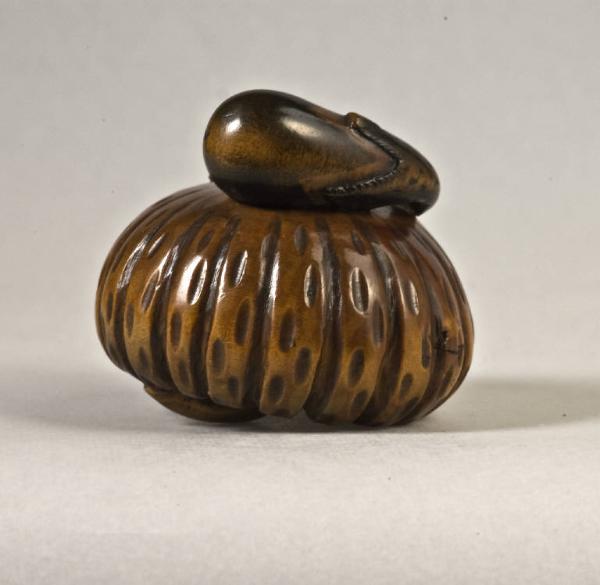 Il netsuke raffigura una zucca (kabocha) sulla quale sta posata una melanzana (nasu). Il gambo della zucca piegato su se stesso funge da himotoshi.