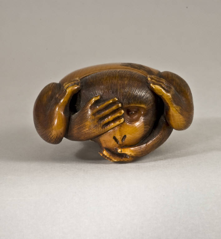 Questo netsuke, in avorio arricchito da fitte trame di inchiostro (sumi) per delineare i particolari, raffigura una scimmia (saru) vestita di una casacca smanicata: le due zampe posteriori sono sollevate fino a coprire i lobi delle orecchie, quella anteriore destra è posata sull'occhio destro, mentre quella sinistra chiude la bocca. Sul dorso compaiono due gruppi analoghi di motivi decorativi con la stilizzazione di una corolla floreale.
