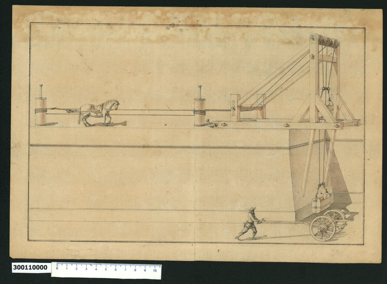 - NOTIZIE STORICO CRITICHE Nell'"Indice" del tomo nel quale era rilegato il disegno viene definito: "Machina per sollevar pesi".\nIl disegno rappresenta una macchina fissata al margine di un bastione o contrafforte che serve a sollevare o abbassare materiali pesanti. \nLa finitura del disegno, la cura dell'inquadratura e l'assenza di quote, fanno pensare a una tavola illustrativa allegata a un trattato, ma probabilmente fa parte degli studi di macchine eseguiti secondo Hellmut Lorenz da Domenico Martinelli nel periodo tra il 1694 e il 1698, durante il quale, già residente a Vienna, lavorò anche in Germania e Olanda (Lorenz 1991, pp. 61- 62).\nSi potrebbe trattare quindi della riproduzione di un manufatto da lui visto in uno di questi paesi, da conservare come esempio o da riproporre come modello a qualche committente.\nIl congegno è costituito da una base rettangolare realizzata con due grosse travi in legno legate da travetti minori, fissata da un lato al terreno con grossi puntoni e ancorata al fianco del contrafforte, nella parte a sbalzo, con due travi inclinate. Sulla parte a sbalzo si erge il castello che porta l'argano principale, collegato con due travi inclinate a un rullo di scorrimento più basso fissato all'estremità della base ancorata al terreno.\nAttraverso il traino di un cavallo, intorno all'argano e ad altri due rulli infissi nel terreno si avvolgono le funi che consentono il movimento alternato verso l'alto e il basso di due casse di legno contenenti i materiali. Il trasporto in piano è invece effettuato da un uomo che spinge un semplice carretto a due ruote, con una lunga asta di manovra e due assi su cui poggiano le casse.