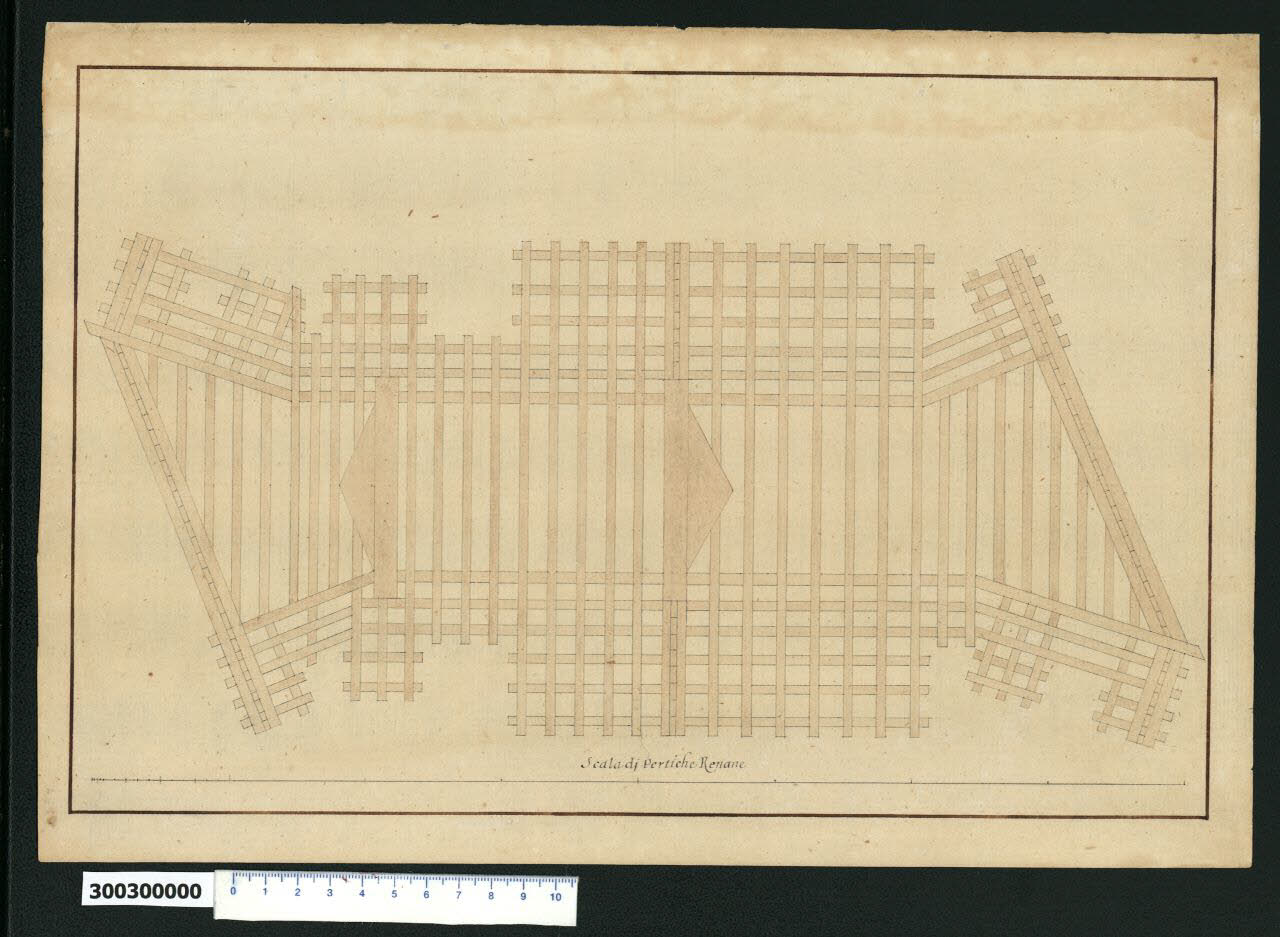 - NOTIZIE STORICO CRITICHE Nell'"Indice" del tomo nel quale era rilegato il disegno viene definito: "Pianta (...) d'una cataratta". \nSi tratta di un disegno relativo a una chiusa (o cataratta), attribuito da Hellmut Lorenz a Domenico Martinelli rappresenta la struttura di base che costituisce le fondamenta del manufatto. \nIl disegno è collegato ad altri tre relativi allo stesso soggetto presenti nella Collezione Sardini Martinelli: la rappresentazione delle due fronti alle estremità della chiusa (Milano, Collezione Sardini Martinelli inv. 3,2bis), la sezione longitudinale (ibidem inv. 3,5) e la pianta che illustra il funzionamento del meccanismo (ibidem inv. 3,5 bis). \nSecondo le indicazioni fornite dalla scala grafica inserita nel disegno, dovrebbe appartenere alla serie di studi di macchine eseguiti da Martinelli in occasione della sua permanenza in territorio renano (Germania e Olanda) tra il 1694 e il 1698. \nSi potrebbe trattare quindi della riproduzione di un manufatto da lui visto in uno di questi paesi, da conservare come esempio o da riproporre come modello a qualche committente. Non è possibile risalire a una collocazione più precisa sul territorio.\nLa struttura di base che fa da fondamento al manufatto, è composta da travetti in legno, intrecciati in corrispondenza delle parti in muratura ed è ancorata al terreno attraverso un fitto sistema di palificazioni, come si evince dai disegni in elevazione.