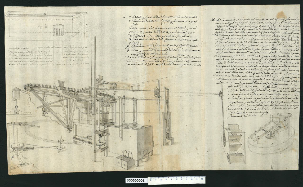 - NOTIZIE STORICO CRITICHE Nell'"Indice" del tomo nel quale era rilegato il disegno viene definito: "Altra machina con spiega- / zioni di Domenico Martinelli".\nIl disegno prospettico mostra il funzionamento di una macina per il grano ed è accompagnato dalla relativa spiegazione e da una legenda che ne illustra le componenti.\nL'attribuzione a Domenico Martinelli, confermata da Hellmut Lorenz, è suffragata oltre che dalla precisazione nell'indice del tomo compilato da Giacomo Sardini, anche dall'esame grafico e dal confronto calligrafico. Il disegno fa parte della serie di studi di macchine che Martinelli affrontò nel corso del suo soggiorno in Olanda, tra il 1695 e il 1698.\nSi potrebbe trattare quindi della riproduzione di un manufatto da lui visto in questo paese, da conservare come esempio o da riproporre come modello a qualche committente.\nIl macchinario, piuttosto complesso, è costituito da una mola che gira per mezzo di una grande ruota dentata imperniata saldamente al terreno e mossa dal traino di un cavallo. La mola è rappresentata anche in un dettaglio a lato, secondo un punto di vista che mette in evidenza il recipiente dove si immette il grano da macinare. Il ciclo di macinazione è automatico: il prodotto derivato viene vagliato ai setacci, costituiti da cinque strati di pergamena con trama man mano più sottile e mossi da un meccanismo laterale illustrato anche in dettaglio a parte. La farina più fine cade in recipienti laterali.\nNell'angolo superiore del foglio è rappresentata la stufa che serve per essiccare il grano, adagiato sopra un panno teso, prima di essere macinato. La stufa è riprodotta in dettaglio sul verso del foglio (Milano, Collezione Sardini Martinelli inv.3,6 V).