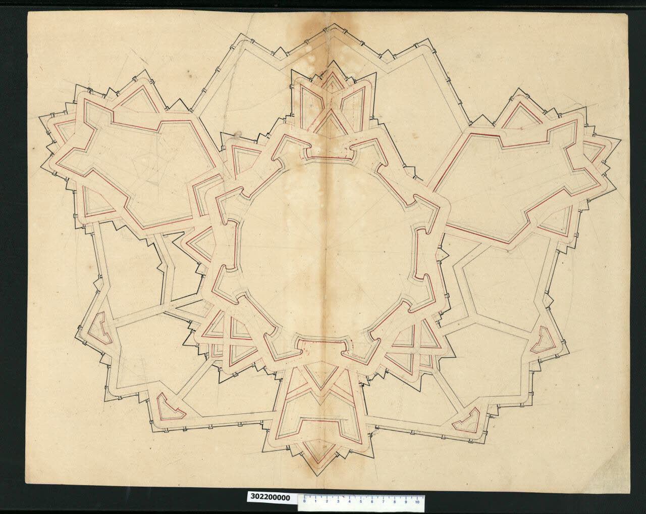 - NOTIZIE STORICO CRITICHE Nell'"Indice" del tomo nel quale era rilegato il disegno viene definito: "Altra Fortezza". \nIl disegno rappresenta probabilmente lo studio di un sistema di fortificazioni "ideale", forse non applicabile a una città esistente trattandosi di un o schema geometrico perfetto che sembra un compendio dei sistemi difensivi più avanzati, costruiti intorno a una pianta ottagonale - quasi circolare - con ai vertici otto bastioni dai fianchi arrotondati e con orecchioni. La forma di questi bastioni e la complessità delle opere difensive (successioni di rivellini, lunette, controguardie, opere a corno, ecc.) proiettate all'esterno in modo da creare un susseguirsi continuo di punte per nuove angolazioni di tiro, ricorda sicuramente i sistemi studiati da Sébastien Le Prestre de Vauban, anche se è noto che l'ingegnere francese rifuggiva dagli studi teorici non applicati a situazioni reali e ideava i sistemi difensivi attraverso l'osservazione "sul campo". Potrebbe trattarsi quindi di uno studio esemplificativo "alla maniera" di Vauban.