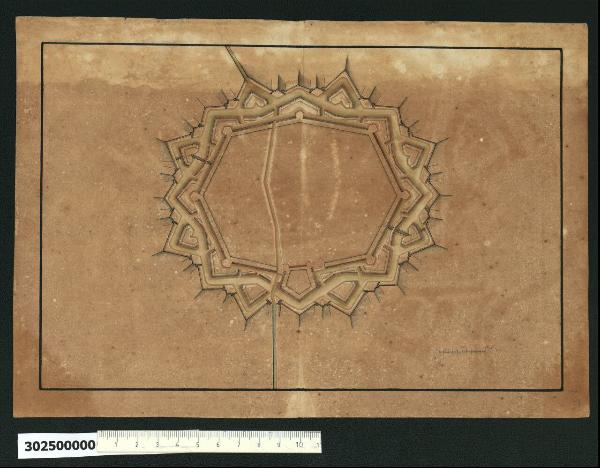 - NOTIZIE STORICO CRITICHE Nell'"Indice" del tomo nel quale era rilegato il disegno viene definito: "Altra Fortezza in Francia".\nIl disegno è la rappresentazione di una città fortificata priva di qualsiasi indicazione, ma da un confronto con l'illustrazione tratta da un "Atlas Portatif" del 1702 pubblicata da Sir Reginald Blomfield (Blomfield 1971, p. 139), si è potuto stabilire che si tratta della città di Landau in Alsazia, a poche miglia a nord-ovest di Karlsruhe. \nLandau rientra tra le città fortificate da Sébastien le Prestre de Vauban e si possono riscontrare le caratteristiche dei suoi sistemi di difesa, anche se si tratta di un disegno incompleto, mancando le due opere a corno negli angoli nord-est e sud-est. \nLa fortificazione di Landau, realizzata nel 1687 su una pianta ottagonale, con bastioni agli angoli, tenaglie, mezzelune, fossato, cammino coperto, piazza d'armi e glacis, rappresenta una delle prime applicazioni del sistema a torri-bastione, perfezionato successivamente nella città di Neuf-Brisach. \nIl disegno secondo Hellmut Lorenz rivela analogie nella tecnica del tracciato con gli studi eseguiti da Domenico Martinelli. \nLa datazione proposta ricopre l'arco di tempo tra i primi studi di sistemi di fortificazioni analoghi da parte di Vauban (1682) e il rientro di Martinelli in Italia dopo il soggiorno nell'Europa del nord (1698).