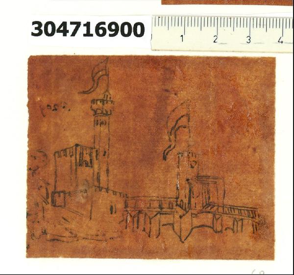 - NOTIZIE STORICO CRITICHE Nell'"Indice" del tomo nel quale il marchese Giacomo Sardini lo aveva rilegato, il disegno viene definito: "Sieguono alcune elucidazioni ricavate dalla Storia Originale di Gio Sercambj nell'Archivio Segreto ... Ponte fortificato forte di Pontetetto p. 209".\nLa grafia delle iscrizioni su questo gruppo di disegni, di cui fa parte quello in esame, è riconducibile alla mano di Sardini, che pertanto si può ritenere l'esecutore dei lucidi. Il supporto, reso trasparente per impregnazione con resina, venne adattato all'esigenza del ricalco su esigue superfici suddividendolo in quattordici piccoli rettangoli. A copiatura ultimata, questi furono incollati in bell'ordine su due carte inserite nella legatura del tomo. L'occasione di procurarsi riproduzioni dal codice tardo trecentesco con le Croniche di Sercambi si dischiuse a Sardini quando ottenne un permesso speciale per accedere alla Tarpea (l'Archivio segreto della Repubblica, oggi in Archivio di Stato), che custodiva quei preziosi manoscritti. Intento a raccogliere appunti dai documenti antichi per arricchire i suoi contributi dedicati alla storia artistica locale, il marchese non esitò a copiare alcune illustrazioni del manoscritto, oggetto di studio anche da parte di altri suoi contemporanei. Catturarono la sua attenzione soprattutto i centri fortificati dei dintorni di Lucca fino a Pisa, ma anche particolari di costume. Il copista preferì soffermarsi solo su dettagli dei riquadri figurati e, nei vari lucidi, si possono trovare brani tratti da una sola (come nel caso in esame riconducibile al capitolo DXXIX del manoscritto) o da più vignette.
