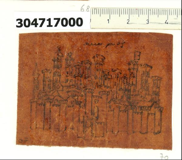 - NOTIZIE STORICO CRITICHE Nell'"Indice" del tomo nel quale il marchese Giacomo Sardini lo aveva rilegato, il disegno viene definito: "Sieguono alcune elucidazioni ricavate dalla Storia Originale di Gio Sercambj nell'Archivio Segreto ... Veduta della Citta di Lucca p. 69".\nLa grafia delle iscrizioni su questo gruppo di disegni, di cui fa parte quello in esame, è riconducibile alla mano di Sardini, che pertanto si può ritenere l'esecutore dei lucidi. Il supporto, reso trasparente per impregnazione con resina, venne adattato all'esigenza del ricalco su esigue superfici suddividendolo in quattordici piccoli rettangoli. Il foglio in esame presenta porzione di filigrana complementare a quella del foglio con inventario 3,47 f. A copiatura ultimata, questi furono incollati in bell'ordine su due carte inserite nella legatura del tomo. L'occasione di procurarsi riproduzioni dal codice tardo trecentesco con le Croniche di Sercambi si dischiuse a Sardini quando ottenne un permesso speciale per accedere alla Tarpea (l'Archivio segreto della Repubblica, oggi in Archivio di Stato), che custodiva quei preziosi manoscritti. Intento a raccogliere appunti dai documenti antichi per arricchire i suoi contributi dedicati alla storia artistica locale, il marchese non esitò a copiare alcune illustrazioni del manoscritto, oggetto di studio anche da parte di altri suoi contemporanei. Catturarono la sua attenzione soprattutto i centri fortificati dei dintorni di Lucca fino a Pisa, ma anche particolari di costume. Il copista preferì soffermarsi solo su dettagli dei riquadri figurati e, nei vari lucidi, si possono trovare brani tratti da una sola o da più vignette. Nel caso in esame la pagina istoriata alla quale Sardini presta attenzione è quella che celebra la fine della dominazione pisana e la concessione della "Libertas" alla città di Lucca ad opera dell'Imperatore Carlo IV (capitolo CLXXIII).