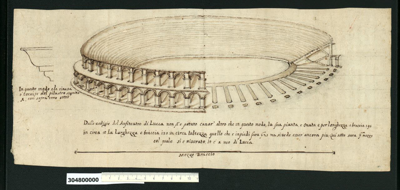 - NOTIZIE STORICO CRITICHE Nell'"Indice" del tomo nel quale era rilegato il disegno viene definito: "Anfiteatro di Lucca".\nIl disegno propone la ricostruzione grafica dell'anfiteatro di Lucca con il suo probabile dimensionamento originario e un dettaglio del profilo della cornice dei pilastri. Si tratta di uno spaccato prospettico che mostra la linea delle fondazioni, la struttura che reggeva la cavea a gradoni e il doppio ordine di arcate sovrapposte, di cui quelle superiori e arretrate rispetto al filo delle sottostanti. Le arcate sono impostate su pilastri rifiniti da una cornice in doppio ordine.\nL'autore del disegno non è certo, ma si suppone che appartenesse alla città di Lucca.\nL'Anfiteatro di Lucca fu realizzato nel II sec. d.C. all'esterno delle mura e vi si svolsero spettacoli per circa quattro secoli fino a che venne chiuso e lasciato in stato di abbandono. L'involucro antico, abbandonato già nel VI secolo e utilizzato in età longobarda come luogo di adunanze, in epoca medioevale fu modificato in maniera sostanziale, inglobandolo all'interno della città e costruendovi sopra case e palazzi che si adattarono allo stretto modulo romano, con abitazioni monofamiliari su più piani, ciascuna compresa entro una campata. Nel Cinquecento vi trovarono posto anche una prigione e il magazzino del sale. All'interno lo spazio, interrato di circa 3 metri, venne frazionato in orti e, più tardi, occupato da varie costruzioni. Nel 1830 Lorenzo Nottolini, incaricato da Carlo Lodovico, progettò la sistemazione urbanistica dell'area, che fu liberata e regolarizzata in forma di piazza ellittica perimetrata da case e destinata al mercato alimentare, in seguito rimosso senza modificare le residenze all'intorno. La configurazione della planimetria originaria è così ancora leggibile e parte dell'anello conserva tratti dei due ordini di 54 arcate su pilastri che reggevano la cavea, capace di diecimila spettatori.\nIl disegno dell'anfiteatro è del tutto simile a una incisione pubblicata da Pierre Mortier, in Nouveau Théatre d'Italie ..., vol. I, Amsterdam 1704 (Bedini, Fanelli 1998, fig. 148). Valutando l'iscrizione che accompagna il disegno, si ritiene che la rappresentazione sia ricavata da un esame dei resti dell'anfiteatro ancora visibili e da un'ipotesi di conformazione plausibile. Pertanto si pensa che il disegno sia precedente all'incisione e che, pur non essendo stato tracciato espressamente per realizzarla, sia servito come base per illustrare il monumento scomparso.