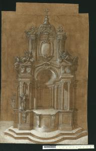 - NOTIZIE STORICO CRITICHE Nell'"Indice" del tomo nel quale era rilegato il disegno viene definito: "Altro altare".\nL'altare qui rappresentato non è identificabile con certezza e si suppone possa risalire, insieme ad altri due esemplari presenti all'interno della Collezione con le stesse caratteristiche stilistiche (Milano, Collezione Sardini Martinelli invv. 9,1 e 9,20), al primo periodo romano di Domenico Martinelli. Secondo Hellmut Lorenz (Lorenz 1991, M KAT 87, pagg. 267-268), potrebbe trattarsi di un altare per una chiesa raffigurata in una serie di disegni presenti nella Collezione (Milano, Collezione Sardini Martinelli invv. 9,3; 9,5; 9,7 R e V; 9,8; 9,9; 9,10) ideata per il re polacco Jan III Sobieski (1679-1696), la cui politica culturale e artistica era orientata principalmente verso Roma e all'ambiente dell'Accademia di S. Luca. Una data possibile per il progetto di questo altare di Martinelli potrebbe quindi essere il 1684, quando il re polacco manda a Roma il suo confessore, il lucchese Tommaso Talenti, quale inviato artistico.\nL'attribuzione a Martinelli deriva dalla particolare tecnica di rappresentazione da lui usata proprio in quel periodo, come riferisce anche il biografo Giovanni Battista Franceschini nelle sue "Memorie della vita di Domenico Martinelli" del 1772 (Lorenz 1991, p. 130): il disegno è tracciato su carta preparata di colore marrone scuro e le zone in luce sono evidenziate con sfumature bianco-argentate. L'altare racchiude nella sua notevole plasticità tutti gli elementi architettonici espressione del gusto barocco romano, dalla giustapposizione di elementi concavi e convessi, all'inserimento nella composizione di gruppi scultorei.\nIl disegno presenta contestualmente due soluzioni progettuali: nella parte inferiore dell'altare, la proposta di semplici colonne binate sul basamento rettilineo a destra della sporgenza convessa centrale, è arricchita sul lato sinistro da statue poggianti su mensole a voluta; nella parte superiore dell'altare, gli angioletti seduti sulla cornice terminale a sinistra, sono sostituiti da vasi sulla destra.\nAl centro della composizione si nota un pellicano che nutre con il proprio sangue i suoi piccoli, simbolo del sacrificio di Cristo.