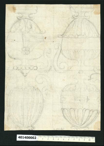 - NOTIZIE STORICO CRITICHE Il disegno non citato nell'Indice del tomo in cui era rilegato e di cui non si conosce l'autore, presenta quattro studi per vasi coperti rappresentati sul foglio a due a due opposti rispetto alla mezzeria.\nLa forma complessiva è simile per i quattro vasi: una base di sostegno, l'invaso ovoidale più bombato nella parte superiore, una stretta imboccatura chiusa da un coperchio con pomolo e manici a forma di volute. Le variazioni riguardano sostanzialmente la decorazione superficiale dell'invaso, con una corolla di base costituita alternativamente da foglie d'acanto, petali aperti o chiusi, che racchiudono solo metà vaso, per cui la parte superiore riprende il motivo della corolla di petali o foglie d'acanto rivolta verso il basso o in alternativa presenta un nastro fermato da un fiore. Nel quarto caso la corolla di petali chiusi che parte dalla base racchiude tutto il vaso fino all'imboccatura. La proposta di datazione si riferisce a un riscontro di produzione di oggetti simili intorno al primo quarto del XVII secolo, cui si è attribuito anche il disegno sul recto.