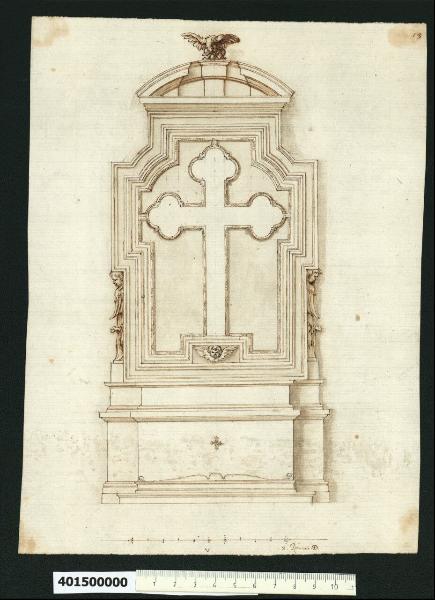 - NOTIZIE STORICO CRITICHE Nell'"Indice" del tomo nel quale era rilegato il disegno viene definito: "Altare misurato a palmi romani / con la marca D.".\nNon è stato possibile identificare l'altare raffigurato in questo disegno, ma dall'analisi stilistica e dalla presenza di una sigla "D", si potrebbe avanzare l'ipotesi, da verificare, che si tratti di un disegno di Domenico Martinelli, eseguito durante il primo periodo di soggiorno a Roma.\nLa composizione che si erge sopra la base rafforzata da cornici dell'altare, è costituita da una grande croce latina con terminazione trilobata dei bracci incastonata in una campitura sagomata e incorniciata in modo da sottolinearne la forma. Una testina di un cherubino è alla base della croce sotto un rialzo della cornice più interna, mentre due figure di angeli dalle ali ripiegate che sorgono da foglie d'acanto, sorreggono lo sporto della cornice esterna. Il tutto è sormontato da un frontone curvilineo spezzato, con al centro un elemento che simula un piedistallo su cui è posato un pellicano che nutre con il proprio sangue i suoi piccoli, simbolo del sacrificio di Cristo.\nUn disegno con una composizione molto simile, che potrebbe costituire una variante progettuale di questo altare, è presente all'interno del VI tomo della Collezione (Milano, Collezione Sardini Martinelli inv. 6,150).