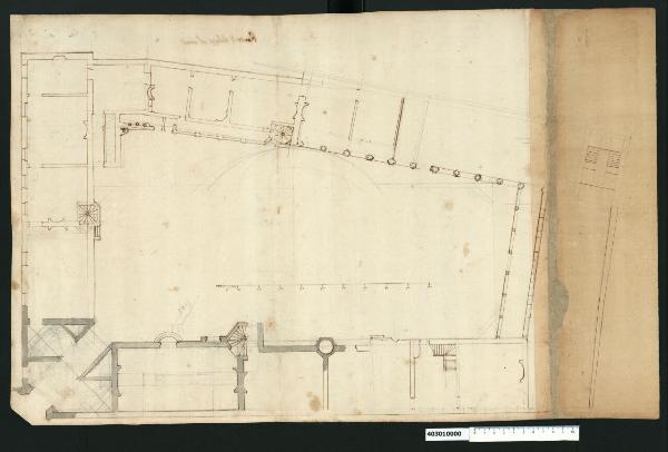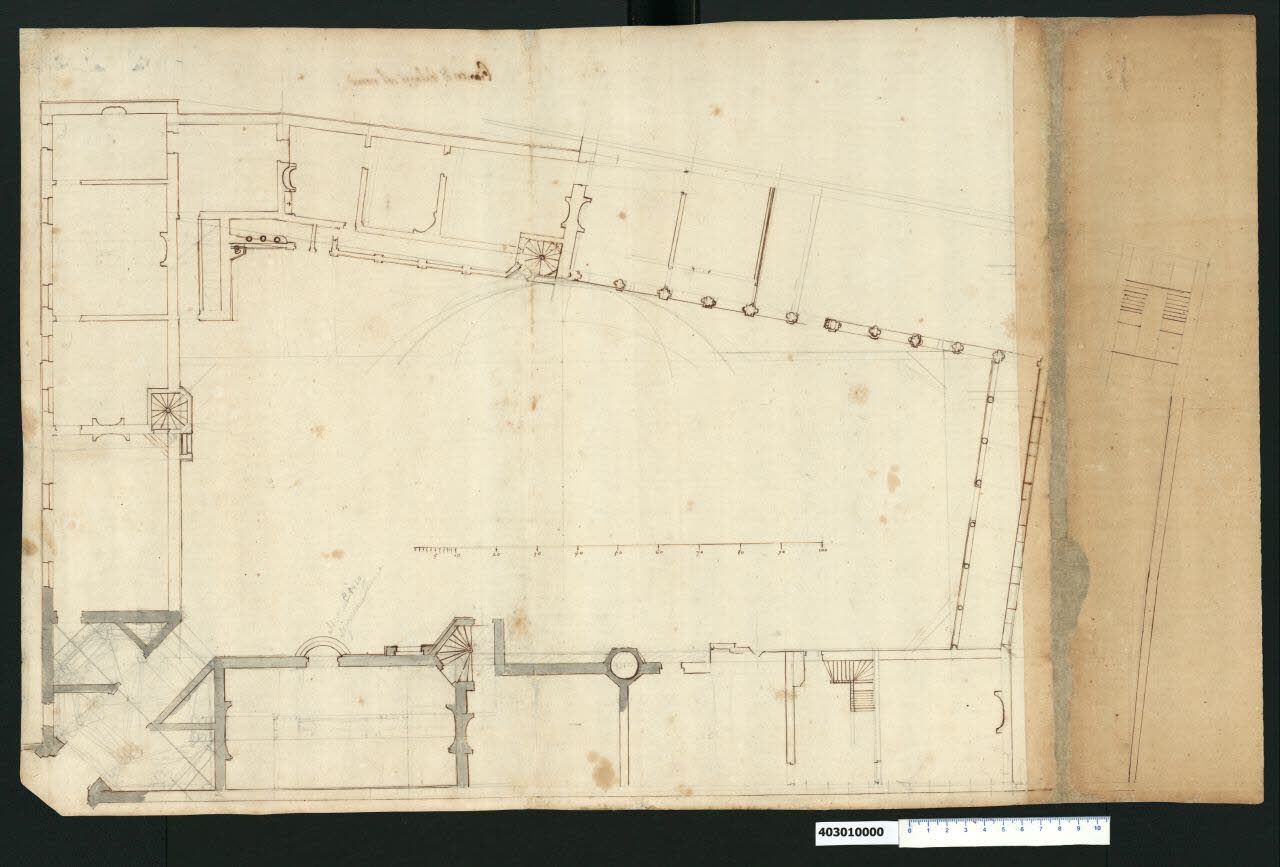 - NOTIZIE STORICO CRITICHE Nell'"Indice" del tomo nel quale era rilegato il disegno viene definito: "Pianta per il Principe di / di Vademonte a Brusselles nella Casa / del Re d'Inghilterra. Vi è una iscri- / zione di Domenico Martinelli che porta NB. Gli sbozzi fatti della pian- / ta e degli alzati restarono in Haja / in mano di Diffald ne mai gli ho / potuti avere, e a me non è rimasto / che questo, che me ne dispiace perche era una disposizione carina, e di / mio genio, e che più non posso / ricordarmi. Vi sono annesse alcune / di lui note.".\nDomenico Martinelli tra il 1695 e il 1698 segue il conte Dominik Andreas Kaunitz a L'Aia, dove era stato inviato per una missione diplomatica, ed entra in contatto con il re Guglielmo III d'Orange o con il suo confidente, Charles Henri conte di Vaudémont e principe di Lotaringia. Il re affida nel 1696 a Martinelli la ristrutturazione del suo palazzo di Bruxelles, la cosiddetta "Ancienne Cour", dove era alloggiato anche Vaudémont con la sua famiglia, come si evince dall'iscrizione presente su uno dei disegni relativi conservati all'interno della Collezione (Milano, Collezione Sardini Martinelli inv. 4,30bis/4 V).\nDi questo lavoro sono conservati all'interno della Collezione, oltre a questa pianta, alcuni schizzi e disegni di studio oltre quello già citato (Milano, Collezione Sardini Martinelli invv. 4,30bis/2; 4,30bis/3 R e V; 4,30bis/4 R e 4,30bis/5) e un prospetto che Hellmut Lorenz non attribuisce a Martinelli (Milano, Collezione Sardini Martinelli inv. 4,30bis/1). Altri disegni originali del progetto, secondo quanto riportato nell'iscrizione sul verso di questo disegno in pianta, ripresa sia dal biografo dell'architetto lucchese Giovanni Battista Franceschini in "Memorie della vita di Domenico Martinelli" del 1772, sia da Giacomo Sardini nell'Indice del tomo IV della Collezione, rimasero a L'Aia in mano di un certo Diffels (o Biffels?).\nIl disegno rappresenta la pianta del piano terreno del palazzo, di forma trapezoidale, sommariamente tracciata e acquerellata unicamente nel tratto in prossimità dell'atrio d'ingresso e dello scalone, su cui Martinelli ha formulato delle ipotesi progettuali a grafite. \nUna linea leggera tracciata all'interno del cortile indica l'idea di una rettifica dello stesso con l'introduzione di un'esedra (di ampiezze variabili) sul lato lungo e di angoli smussati a 45 gradi per riprendere quello già obliquo dell'ingresso. Qui Martinelli sostituisce lo stretto passaggio con un vestibolo ottagonale, coperto da una volta ribassata e impreziosito da colonne leggermente staccate dai muri perimetrali; il vestibolo è più precisamente raffigurato in un dettaglio successivo e negli schizzi dell'alzato (Milano, Collezione Sardini Martinelli invv. 4,30bis/4 R; 4,30bis/3 V). Lo scalone di lato al vestibolo, appena accennato, è una semplice variante del tipo usato per il Palazzo Kaunitz-Liechtenstein a Vienna (Milano, Collezione Sardini Martinelli inv. 4,31).
