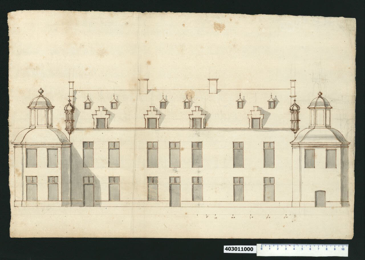 - NOTIZIE STORICO CRITICHE Nell' "Indice" del tomo nel quale era rilegato il disegno viene raggruppato con altri sotto il titolo: "Pianta per il Principe di / di Vademonte a Brusselles nella Casa / del Re d'Inghilterra. [...]". \nDomenico Martinelli tra il 1695 e il 1698 segue il conte Dominik Andreas Kaunitz a L'Aia, dove era stato inviato per una missione diplomatica, ed entra in contatto con il re Guglielmo III d'Orange o con il suo confidente, Charles Henri conte di Vaudémont e principe di Lotaringia. Il re affida nel 1696 a Martinelli la ristrutturazione del suo palazzo di Bruxelles, la cosiddetta "Ancienne Cour", dove era alloggiato anche Vaudémont con la sua famiglia, come si evince dall'iscrizione presente su uno dei disegni relativi conservati all'interno della Collezione (Milano, Collezione Sardini Martinelli inv. 4,30bis/4 V).\nDi questo lavoro sono conservati all'interno della Collezione una pianta del piano terreno, alcuni schizzi e disegni di studio, oltre a quello già citato (Milano, Collezione Sardini Martinelli invv. 4,30bis; 4,30bis/2; 4,30bis/3 R e V; 4,30bis/4 R e 4,30bis/5) e questo prospetto che Hellmut Lorenz non attribuisce a Martinelli. Altri disegni originali del progetto, secondo quanto riportato nell'iscrizione sul verso del disegno in pianta (Milano, Collezione Sardini Martinelli inv. 4,30bis), ripresa sia dal biografo dell'architetto lucchese Giovanni Battista Franceschini in "Memorie della vita di Domenico Martinelli" del 1772, sia da Giacomo Sardini nell'Indice del tomo IV della Collezione, rimasero a L'Aia in mano di un certo Diffels (o Biffels?).\nLorenz ritiene che la stretta facciata sud-est del palazzo con ai lati due bassi padiglioni ottagonali qui rappresentata, possa essere un'idea successiva di rimodernizzazione proposta da un architetto locale. Tuttavia da un confronto calligrafico delle scale grafiche e delle filigrane dei supporti risultate identiche, si può ipotizzare la contemporaneità di realizzazione del prospetto rispetto alla pianta di cui all'inv. 4,30bis. Il disegno potrebbe quindi riferirsi a una fase di progettazione più avanzata, o a una proposta poi non realizzata, in cui Martinelli prevede l'avanzamento del corpo ottagonale del vestibolo, che risulta così isolato dall'antica fronte, riproponendolo anche sul versante opposto in modo da creare una simmetria di facciata.\nSopra il padiglione a destra è tracciato uno schizzo a matita con una variante arretrata e più alta, che potrebbe essere la prima soluzione più aderente alla rappresentazione in pianta.