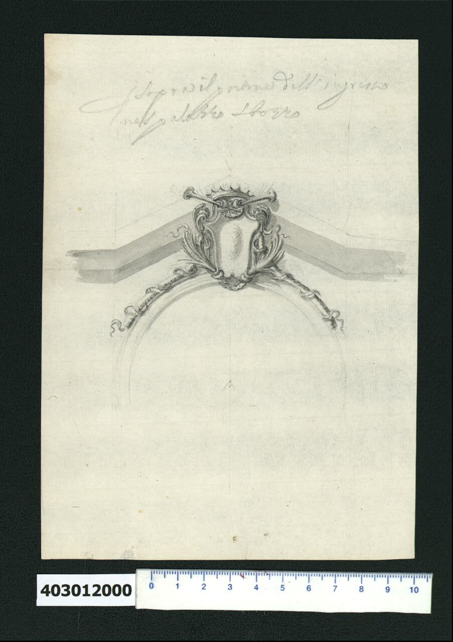 - NOTIZIE STORICO CRITICHE Nell' "Indice" del tomo nel quale era rilegato il disegno viene viene raggruppato con altri sotto il titolo: "Pianta per il Principe di / di Vademonte a Brusselles nella Casa / del Re d'Inghilterra. [...]".\nDomenico Martinelli tra il 1695 e il 1698 segue il conte Dominik Andreas Kaunitz a L'Aia, dove era stato inviato per una missione diplomatica, ed entra in contatto con il re Guglielmo III d'Orange o con il suo confidente, Charles Henri conte di Vaudémont e principe di Lotaringia. Il re affida nel 1696 a Martinelli la ristrutturazione del suo palazzo di Bruxelles, la cosiddetta "Ancienne Cour", dove era alloggiato anche Vaudémont con la sua famiglia, come si evince dall'iscrizione presente su uno dei disegni relativi conservati all'interno della Collezione (Milano, Collezione Sardini Martinelli inv. 4,30bis/4 V).\nDi questo lavoro sono conservati all'interno della Collezione anche una pianta del piano terreno, un prospetto e alcuni schizzi e disegni di studio, oltre quello già citato (Milano, Collezione Sardini Martinelli invv. 4,30bis; 4,30bis/1; 4,30bis/3 R e V; 4,30bis/4 R e 4,30bis/5), tra cui questo stemma per il portone del palazzo. \nAltri disegni originali del progetto, secondo quanto riportato nell'iscrizione sul verso del disegno in pianta (Milano, Collezione Sardini Martinelli inv. 4,30bis), ripresa sia dal biografo dell'architetto lucchese Giovanni Battista Franceschini in "Memorie della vita di Domenico Martinelli" del 1772, sia da Giacomo Sardini nell'Indice del tomo IV della Collezione, rimasero a L'Aia in mano di un certo Diffels (o Biffels?).\nLo stemma, inserito al centro dell'arcata del portone, tra questa e la trabeazione triangolare sovrastante, è dominato da una corona indicante la casa regnante con due trombe serrate da due riccioli che trattengono una conchiglia. Lo stemma, leggermente bombato all'interno, ma privo di raffigurazioni, ha altri due riccioli laterali da cui partono le trecce e i nastri che circondano l'arcata del portone e due nella parte inferiore che racchiudono un'altra conchiglia e serrano due fronde rivolte verso l'alto.\nUn motivo analogo (con corona, trombe, e treccia con nastro che scende intorno al portone) si ritrova in un disegno di Domenico Martinelli per la porta principale della Galleria del Castello di Austerlitz (Domenico Martinelli (catalogo), 2006 cat. 16, 17 p. 110).