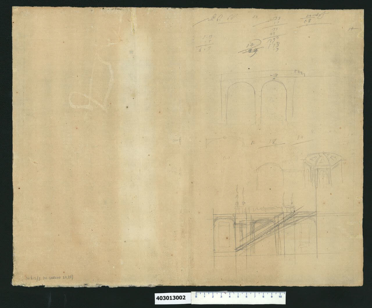 - NOTIZIE STORICO CRITICHE Il disegno, riprodotto sul verso del supporto del precedente (Milano, Collezione Sardini Martinelli inv. 4,30bis/3 R), rappresenta lo schizzo in sezione dello scalone del palazzo, ancora in fase di studio riguardo l'inclinazione della rampa e altri due schizzi: il primo è una rappresentazione prospettica riguardante probabilmente il soffitto del vestibolo, l'altro accenna due arcate inframmezzate da un pilastro, sovrastate da un solaio piano con tre gradini (forse l'arrivo dello scalone di cui sopra).