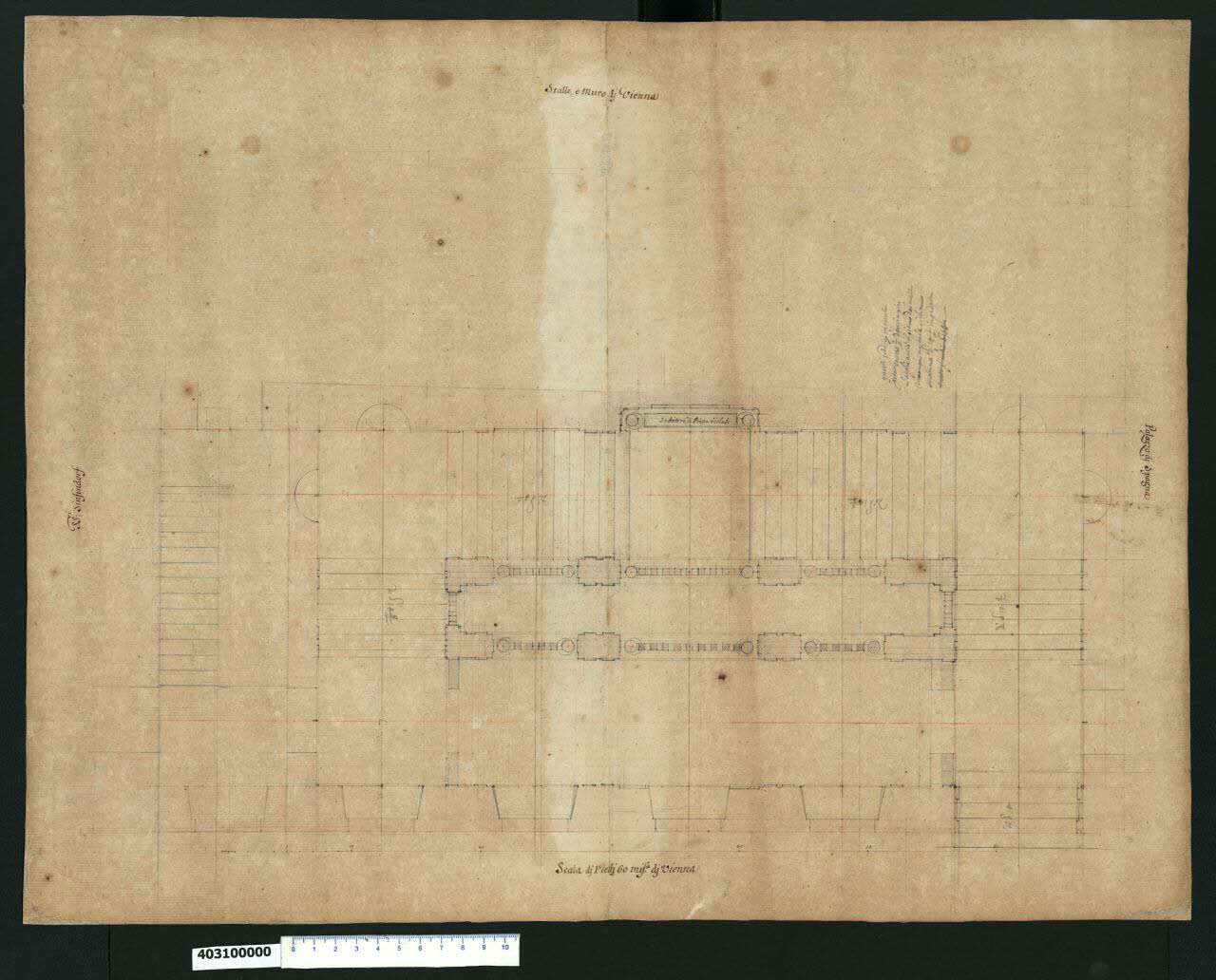 - NOTIZIE STORICO CRITICHE Il disegno, che non è citato nell'"Indice" del tomo nel quale era rilegato, rappresenta uno studio progettuale realizzato da Domenico Martinelli intorno al 1696 per lo scalone di palazzo Kaunitz-Liechtenstein a Vienna.\nLa progettazione di palazzo Kaunitz-Liechtenstein a Vienna, iniziata nel 1689 da Henrico Zuccalli - architetto di corte a Monaco di Baviera - su commissione del Conte Dominik Andreas Kaunitz, passò nel 1692 nelle mani di Domenico Martinelli. \nNel 1694 l'edificio ancora in fase di costruzione fu venduto dal conte Kaunitz al principe Johann Adam Andreas Liechtenstein, ma Martinelli continuò il suo lavoro per il nuovo proprietario, anche se alcuni elementi fondamentali della costruzione, quali portali e attrezzature interne, sono da attribuire ad artisti successivi.\nIl palazzo, costruito su un terreno acquistato da Kaunitz in due tempi (1686 e 1689), è costituito in pianta da un blocco edilizio di tre ali che racchiudono una corte interna. La quarta ala rimasta inizialmente incompleta per mancanza di terreno, sarà realizzata gradualmente dal proprietario successivo.\nIl lavoro di progettazione svolto da Zuccalli riguarda probabilmente l'impostazione generale dell'impianto, rilevabile da un disegno di G. Niemann del 1882 pubblicato da Hellmut Lorenz (Lorenz 1991, MZ KAT 66, fig. 237 p. 228). Zuccalli si occupa della disposizione del vestibolo, della scala e dei disimpegni e fornisce l'impianto generale della facciata, che riprendeva lo schema di palazzo Chigi-Odescalchi di Bernini, forse su richiesta del proprietario. Del suo progetto sono presenti all'interno della Collezione solo due disegni che mostrano le sezioni dell' edificio con le facciate interne del cortile (Milano, Collezione Sardini Martinelli invv. 9,56 e 9,57).\nLorenz afferma che quando Martinelli interviene nella progettazione, Zuccalli aveva già definito la parte interna più rappresentativa e in gran parte affrontato le costruzioni in muratura (tra il 1690-92); nel 1693 i due primi piani erano già stati completati e la costruzione era a livello del piano nobile fino all'imposta del mezzanino, in muratura rustica (Lorenz 1991, MZ KAT 66, pag. 228).\nA causa dello stato già avanzato della costruzione Martinelli non varia sostanzialmente l'impianto di Zuccalli, ma interviene fondamentalmente nella definizione degli elementi architettonici, caratterizzando in maniera particolare l'edificio nel suo aspetto più rappresentativo: oltre ai dettagli della facciata, di cui all'interno della Collezione è presente un disegno esecutivo (Milano, Collezione Sardini Martinelli inv. 2,25), Martinelli sviluppa quelli dello scalone principale, raffigurato in questo disegno.\nTra i documenti che testimoniano il lavoro dell'architetto lucchese su questa parte del palazzo, il foglio del manoscritto di Lucca, in cui Martinelli il 1 Aprile 1696 scrive da L'Aia a Bitterpfeil che ha spedito insieme ai disegni per Austerlitz anche quello "per la Scala del S. Principe di Liectestain, tanto tempo aspettato" (Biblioteca Statale di Lucca, ms. 1856, f. 4r). \nIl disegno riporta delle correzioni forse rispetto all'impianto ideato da Zuccalli: il muro pieno laterale di sostegno sembra rinforzato nello spessore e così le colonne che affiancano i pilastri nella parte centrale. Sono definite da Martinelli le dimensioni di rampe e pianerottoli, che presentano nicchie semicircolari nei muri adiacenti ed è indicata la misura delle alzate dei gradini. In corrispondenza del pianerottolo intermedio è ricavato in una nicchia un piccolo sedile in pietra tra due colonne. Il parapetto è alleggerito dalle colonnine di sezione quadrata della balaustra.\nLo sviluppo in alzato della scalone è raffigurato in un disegno esecutivo di Bitterpfeil tratto da uno dei manoscritti di Lucca (Biblioteca Statale di Lucca, ms. 1856, f. 221r) e pubblicato da Lorenz (Lorenz 1991, MZ KAT 66, pag. 233 fig. 245).
